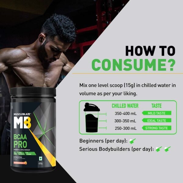 - Quick Recovery: Every serving of Muscleblaze BCAA Pro delivers 2.5g of Glutamine, which helps your muscles to recover quickly, reduce muscle soreness, and hence, prevent any chances of muscle loss.