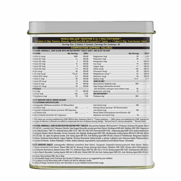 - 3. Joint Blend: When you are an advanced gym-goer, you have no room for joint discomfort, pain, or inflammation. The answer for your joint wellness is a wholesome joint blend. MuscleBlaze Biozyme Daily Multivitamin contains a perfect combination that assists in mobility, flexibility, and upkeeps the health of your joints