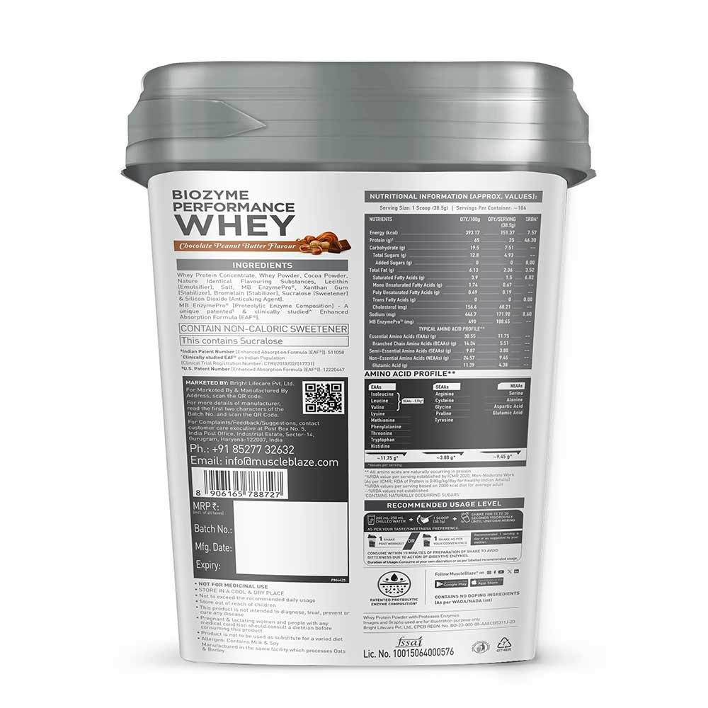 MuscleBlaze Biozyme Performance Whey is a clinically tested whey protein supplement designed to support muscle growth, faster recovery, and improved protein absorption. Powered by an advanced Enhanced Absorption Formula (EAF), it delivers superior bioavailability, making it ideal for athletes, gym-goers, and fitness enthusiasts.