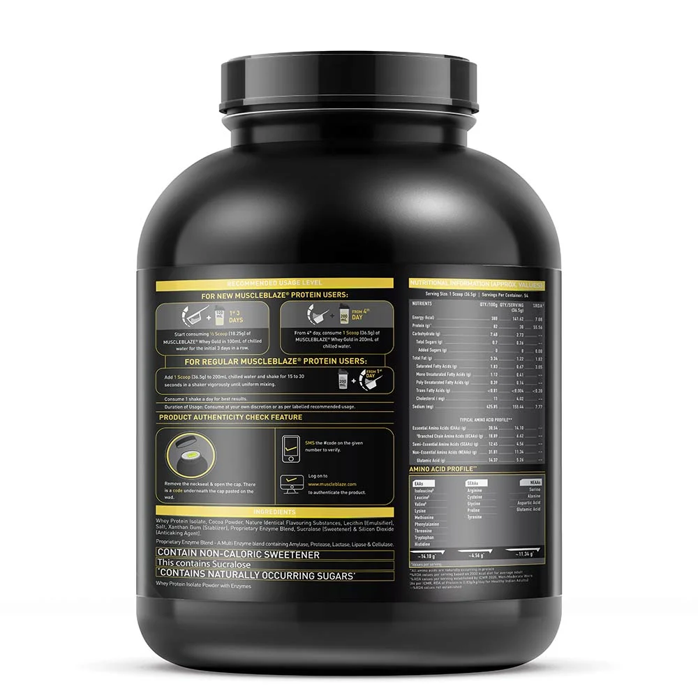 • 2. Made 100% high-quality Whey Isolate, MuscleBlaze Gold Whey Protein provides 14.1 g of EAA(s) and 6.62 g of BCAA(s) per serving, which fuels the muscles with nutrients for muscle build-up. MuscleBlaze Gold Whey Protein is 100% Trans Fat Free and contains No Added Harmful Sweeteners