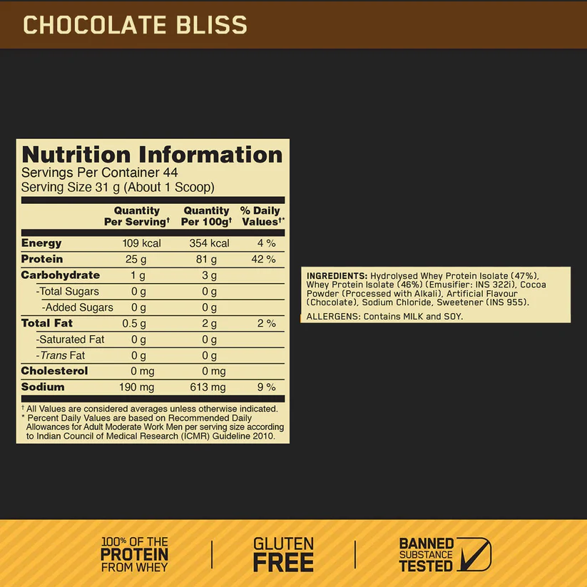 - High Quality Hydrolyzed & Ultra-Filtered Whey Protein IsolateTo create GOLD STANDARD 100% ISOLATE, we start by selecting only the highest quality whey protein, which undergoes a series of sophisticated filtration processes to ‘isolate’ out excess fat, cholesterol, and sugar. A portion of this Whey Protein Isolate is then hydrolyzed – broken down into smaller chains of amino acids. The final product is a fast-digesting complete protein containing no more than 1 gram of carbohydrates, less than a gram of fat, and more than 80% pure protein per Serving.