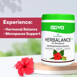 OZiva Plant-Based HerBalance Menopause is specially formulated to help in regulating hormonal balance, as well as helping women transition to menopause by reducing symptoms like hot flashes, night sweats, and more.