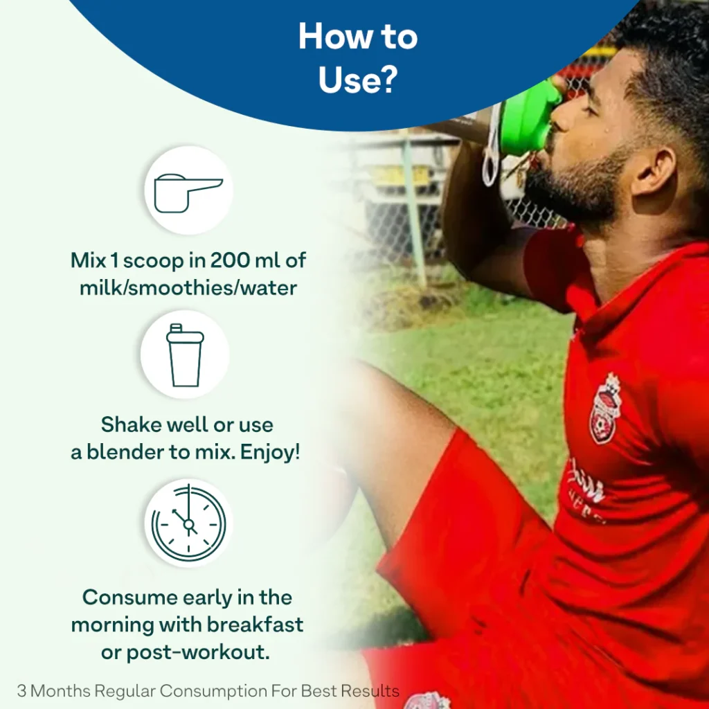 It can be consumed in the morning along with breakfast or at any time of the day in between meals as a regular supplement.